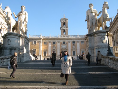 Площадь Капитолия, созданная по проекту Микеланджело. На вершине монументальной лестницы, ведущей на Капитолийскую площадь, - две статуи Диоскуров. А в центре площади, как писала ранее, – копия конной статуи императора Марка Аврелия.